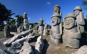 Jeju boasts "three plenties" or "three abundances" - wind , rocks and women. The second of these is due to its formation from an outpouring lava. Ninety percent of its surface is basalt. Around 1750, to scare off invaders, masons carved rocks into forbidding black "dolharubang" or "grandfather stones". The stones remain as a symbol of a distinct ancient culture.